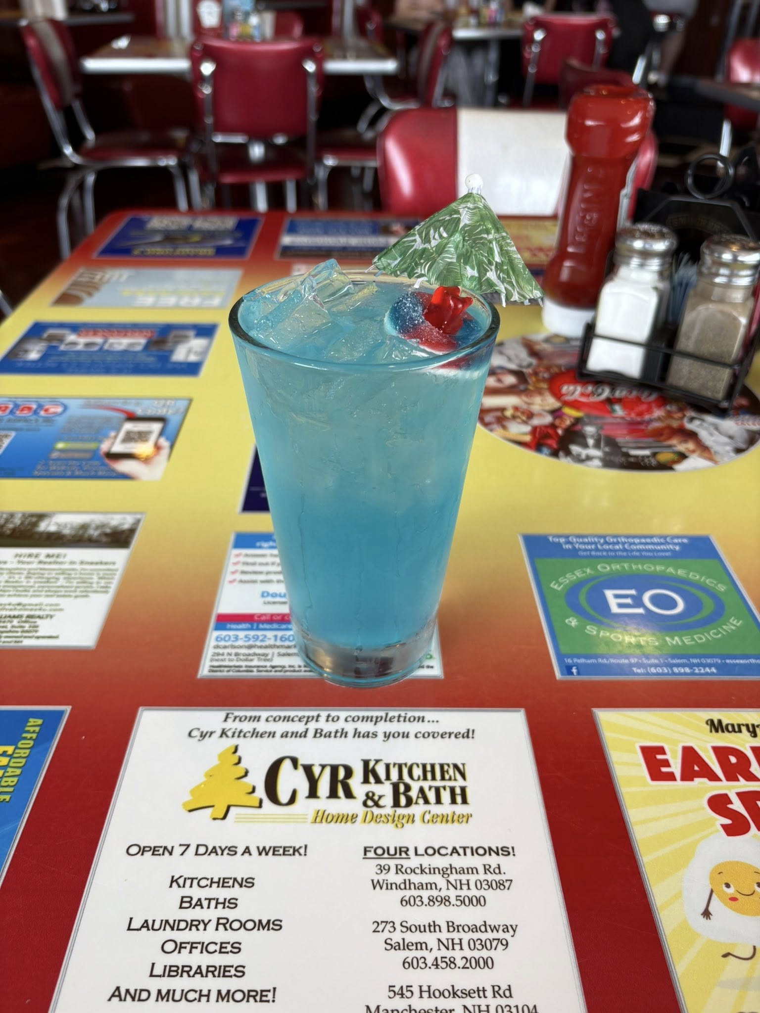 Ad sizes vary by restaurant, as each location has different table dimensions. Every tabletop project is custom-designed to fit that specific restaurant.